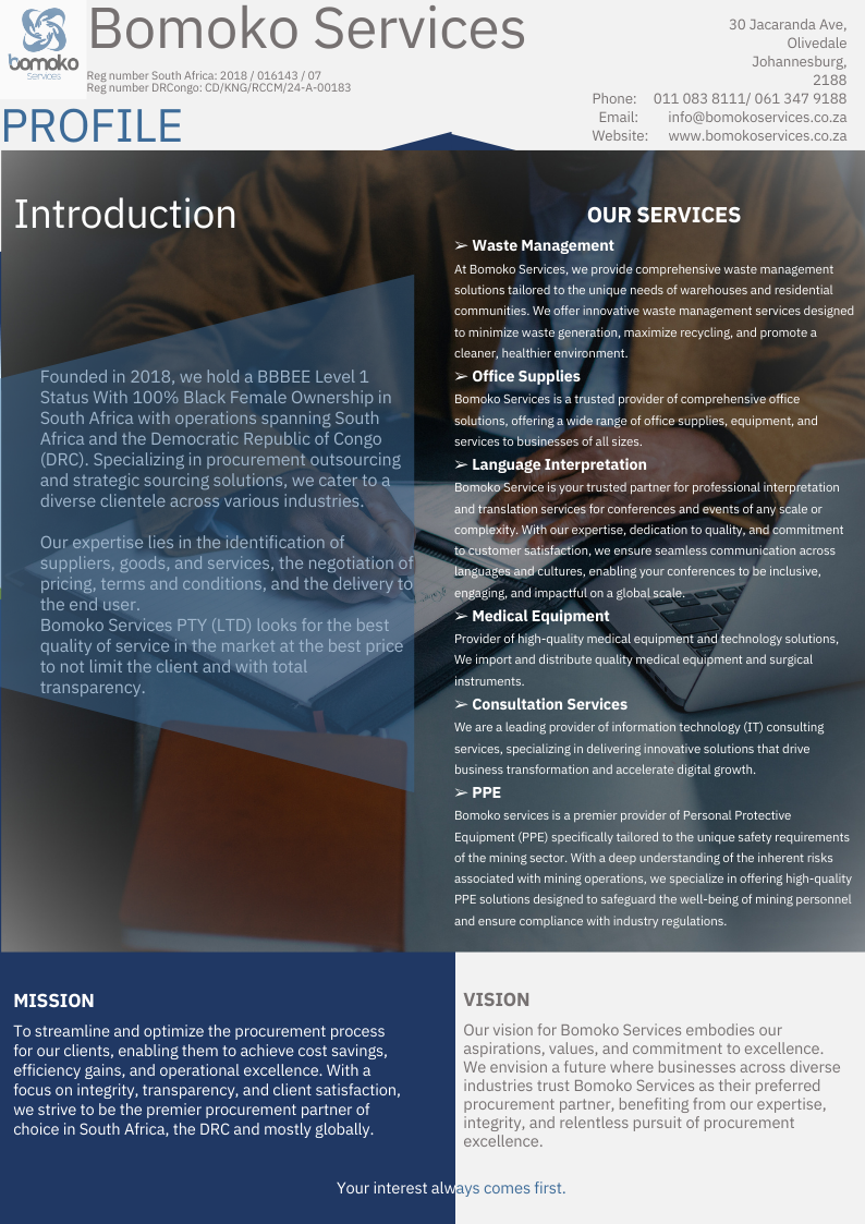Founded in 2018, we hold a BBBEE Level 1 Status With 100% Black Female Ownership in South Africa with operations spanning South Africa and the Democratic Republic of Congo (DRCongo: CD/KNG/RCCM/24-A-00183). Specializing in procurement outsourcing and strategic sourcing solutions, we cater to a diverse clientele across various industries.